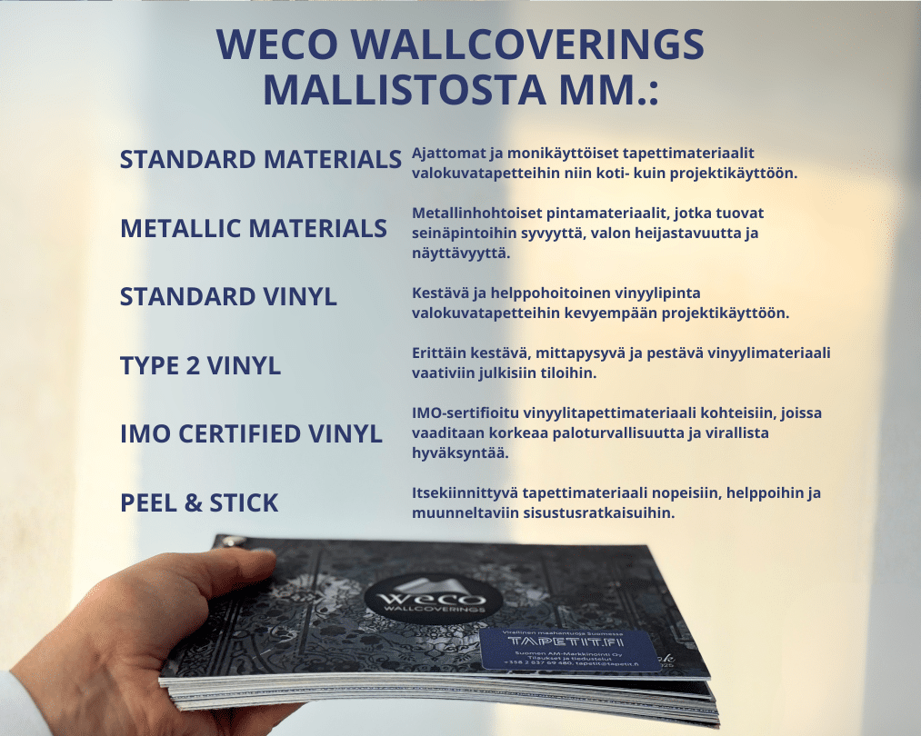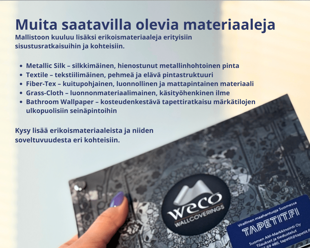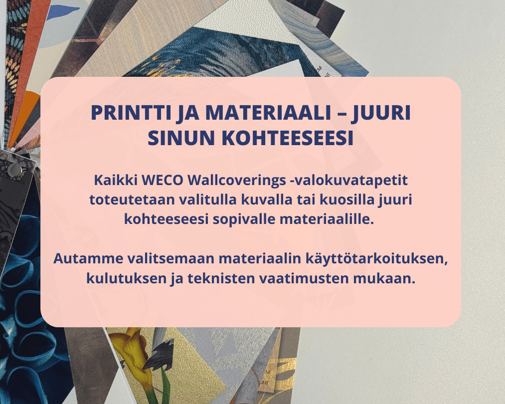 SKun työskentelet suunnittelun tai projektien parissa, kuvatapetin materiaalit kannattaa nähdä ja tunnustella ennen lopullista valintaa.