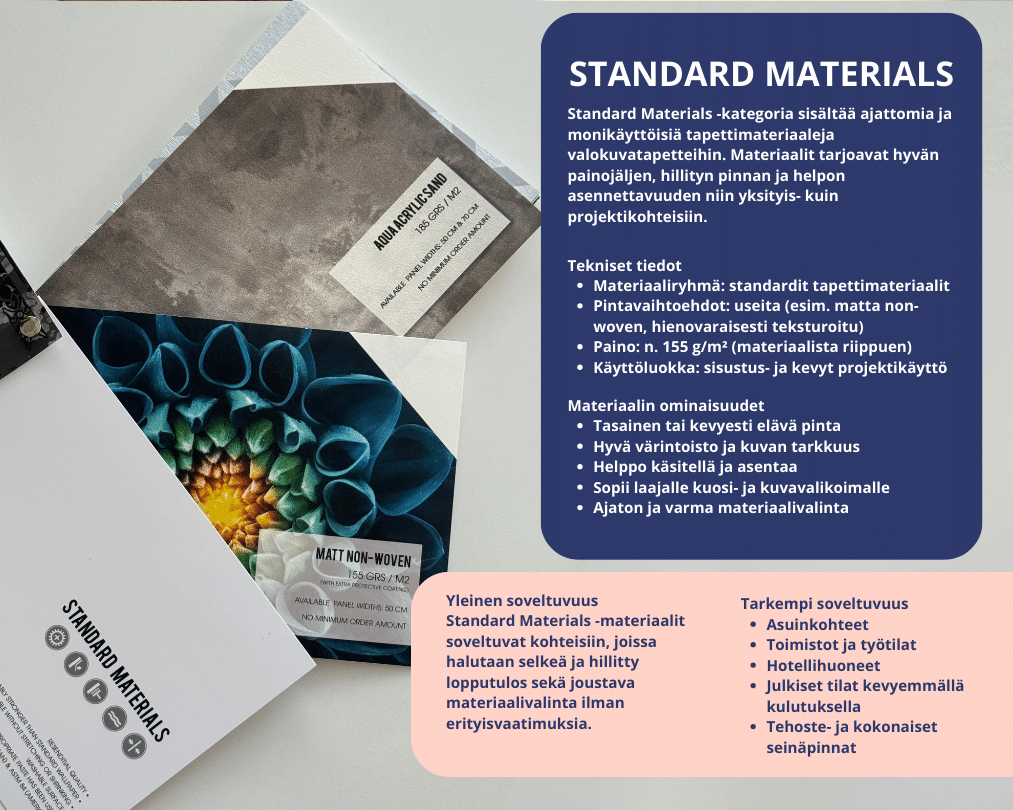 Standard Materials on turvallinen valinta, kun projektiin tarvitaan varma ja monikäyttöinen kuvatapetin materiaali.