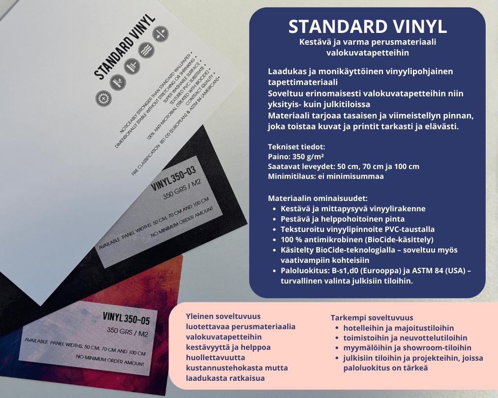 Standard Vinyl on kestävä ja helposti puhdistettava kuvatapetin materiaali.