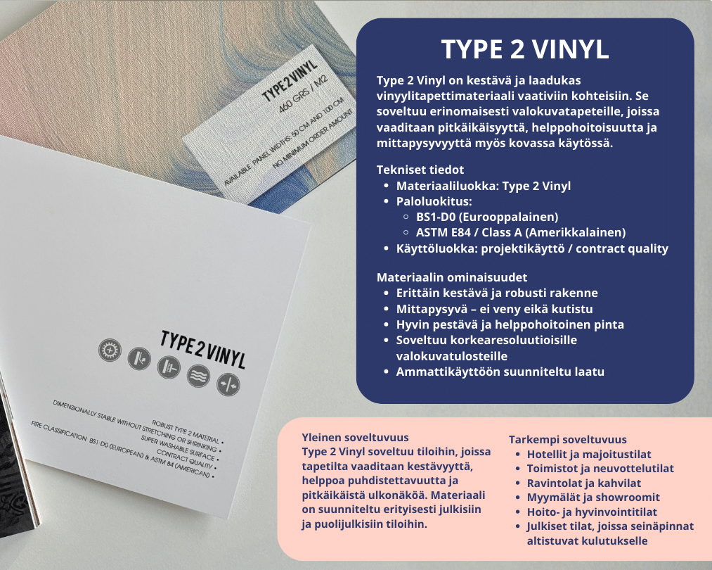 Type 2 Vinyl kuuluu kaikkein kestävimpien kuvatapetin materiaalien joukkoon.
