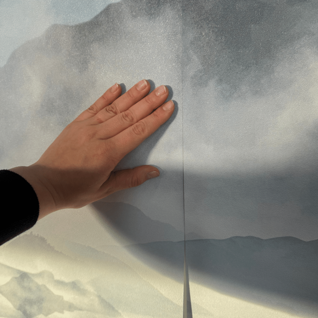 Silota tapetti keskeltä reunoihin lastalla. Tämä vaihe varmistaa siistin lopputuloksen tapetin asennuksessa valmisliimalla.