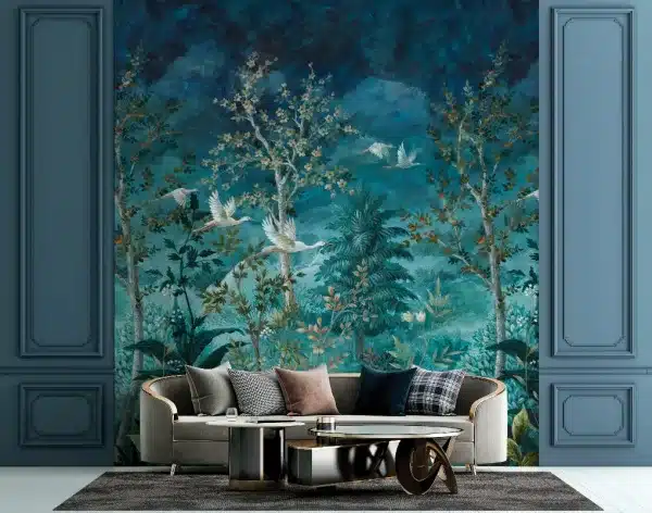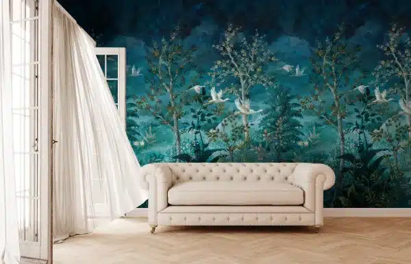 Arboretum Midnight Canopy Blue 99424 kuvatapetti 2,1 x 2,8 m. Tällä sinisävyisellä luonto ja lintuaiheisella valokuvatapetilla luot dramaattisen tunnelman tilaan. Tapetin pintastruktuuri on sileä. Tapetti on valmistettu laadukkaasta kuidusta ja sitä voi puhdistaa pehmeällä sienellä ja miedolla astianpesuaineella. Suosittelemme käyttämään asennuksessa valmisliimaamme.
