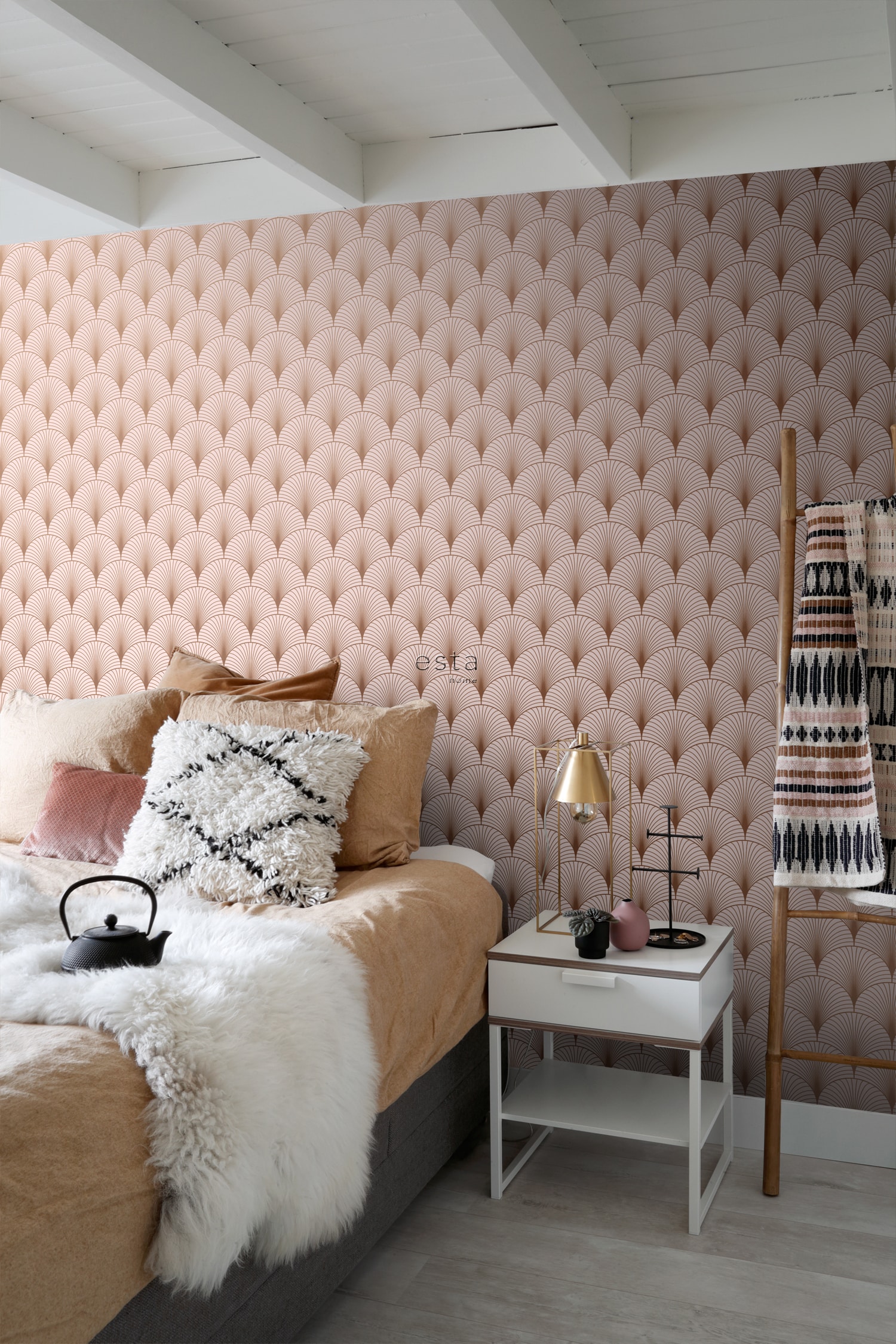 Art Deco tapettimalliston värit ovat lämpimiä ja pehmeitä, kuten esimerkiksi roosa, tummanvihreä,