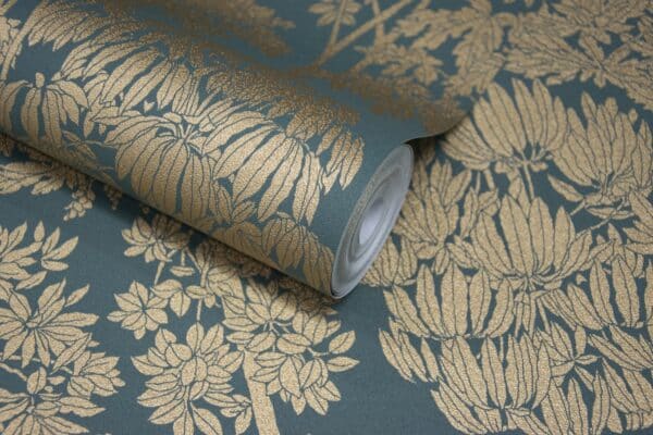 Ciara malliston Tonal Trees tummanvihreä tapetti A63403. Tapetti on kuitupohjainen vinyylitapetti, jonka pinnassa on kullanhohtoisia puukuvioita tummanvihreällä pohjalla.