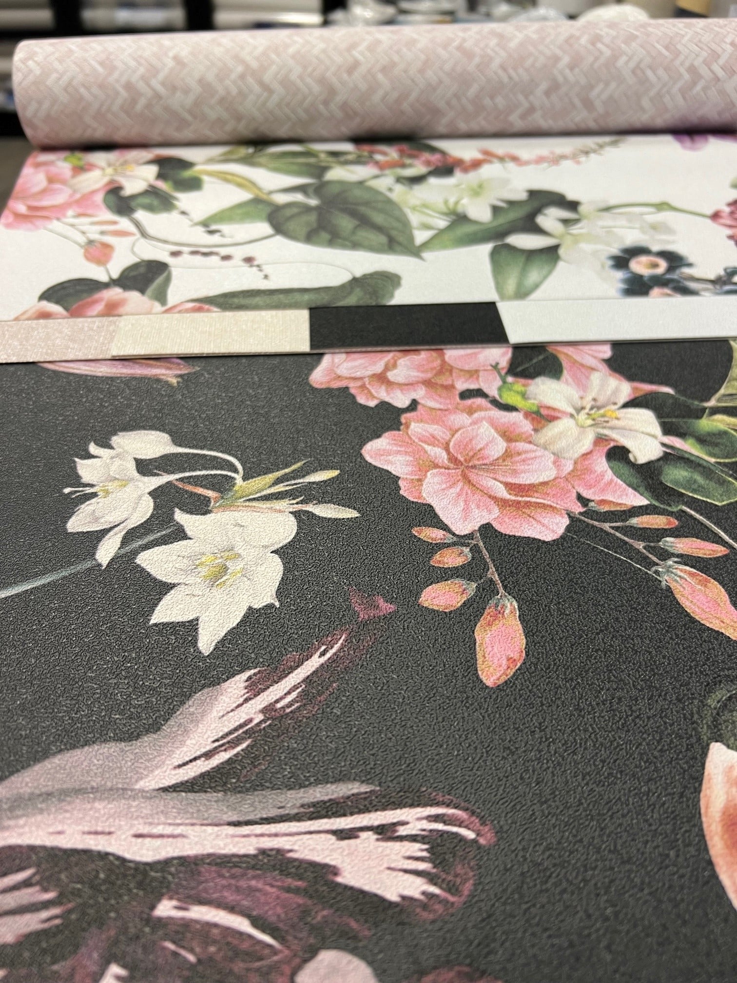 Flora musta kukkatapetti. Tapetissa on sileä mattapintainen pintatekstuuri.