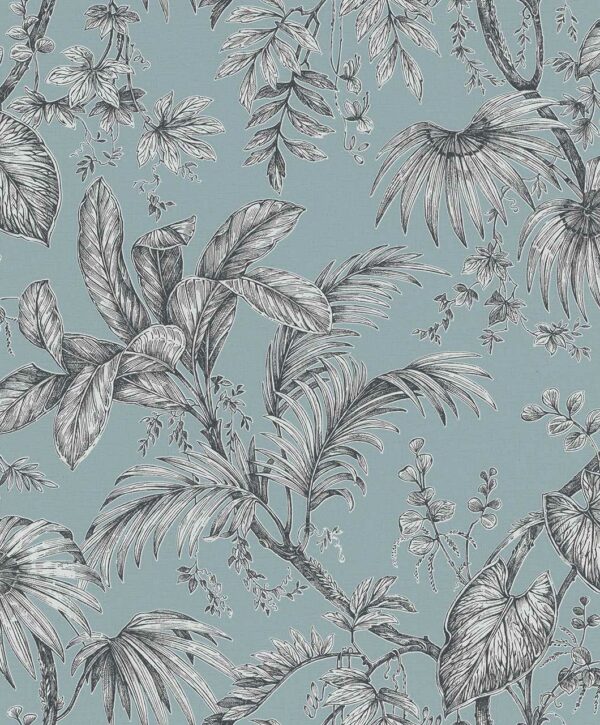 Jackie sinivihreä lehtikuvioinen tapetti. Tapetissa 82340 on kangasmainen pintastruktuuri.