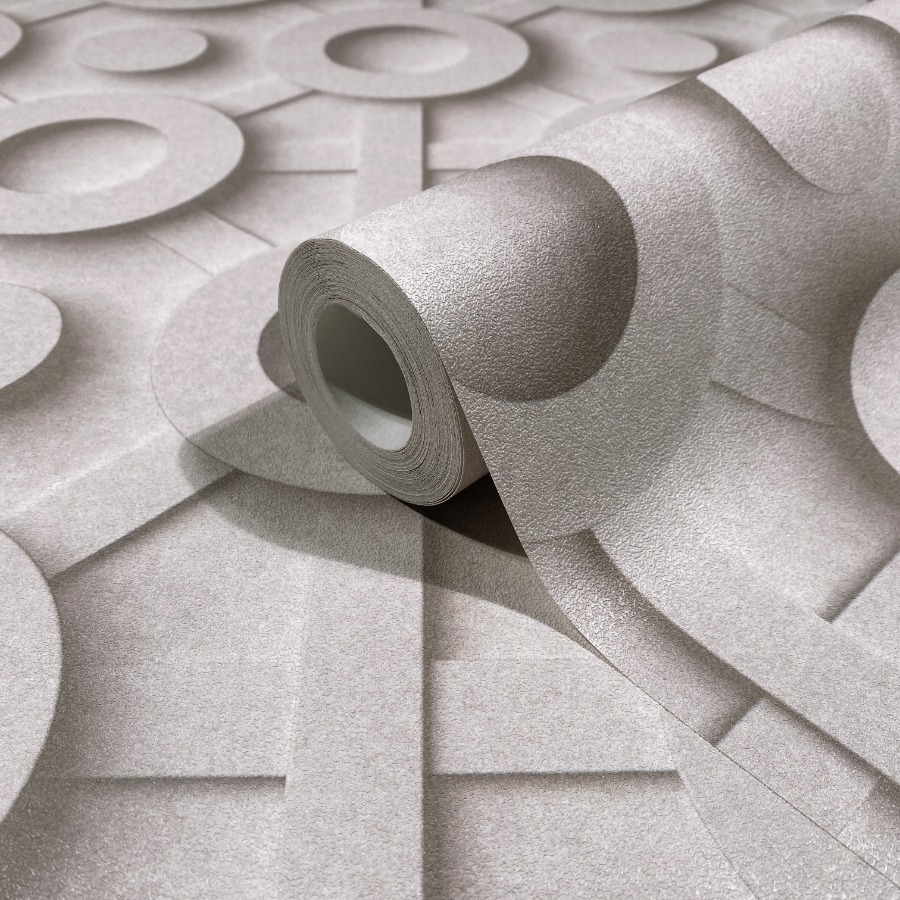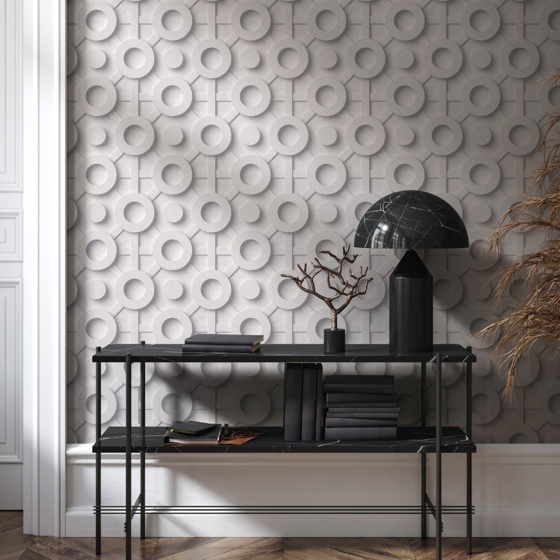 Oriana harmaa geometrinen tapetti 89030 on huippunykyaikainen sisustusratkaisu, joka muuttaa tasaisen seinäpinnan eläväksi ja mielenkiintoiseksi elementiksi. Tapetin hienostunut, viileän vaaleanharmaa sävy ja taitavasti toteutetut varjostukset luovat illuusion kolmiulotteisesta rakenteesta, jossa ympyrät ja linjakkaat ristikot nousevat ja laskevat seinän pinnassa. Tämä graafinen ja arkkitehtuurinen ilme on täydellinen valinta moderniin kotiin, jossa halutaan korostaa selkeitä linjoja ja innovatiivista designia. Harmaa väri on neutraali ja ajaton, mikä tekee siitä erinomaisen pohjan muulle sisustukselle säilyttäen silti huoneen dynaamisen tunnelman.