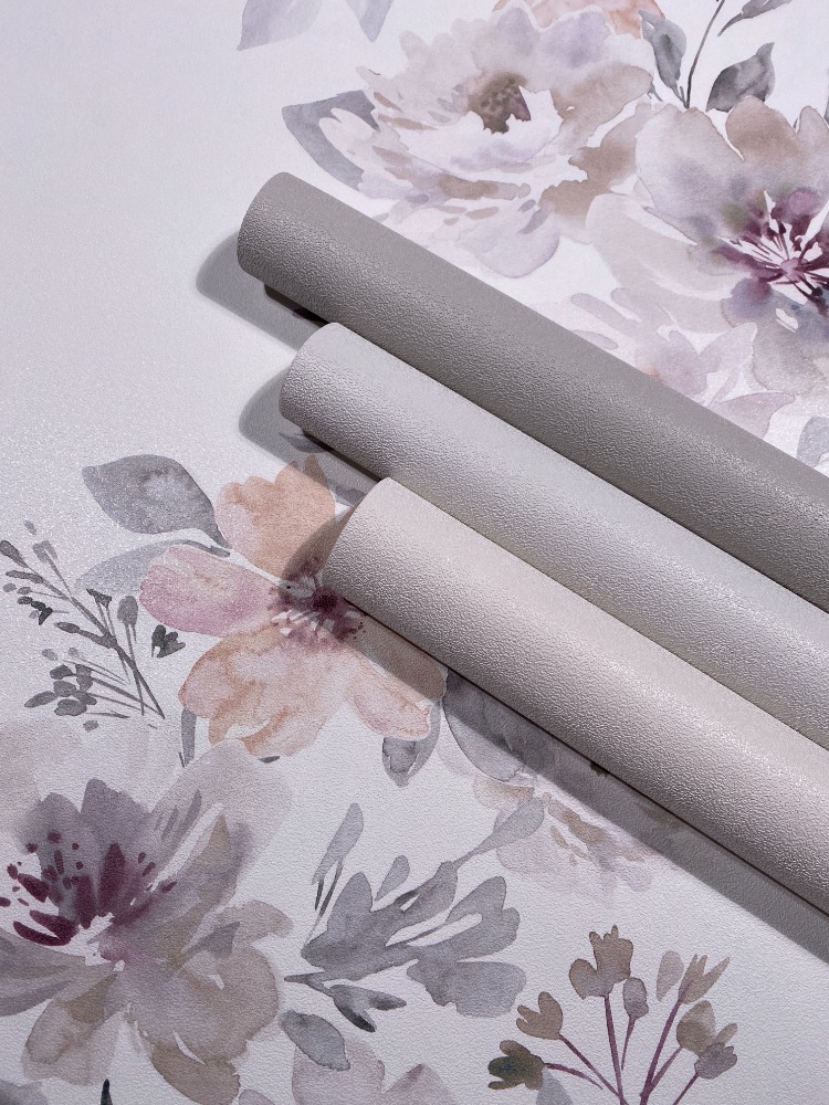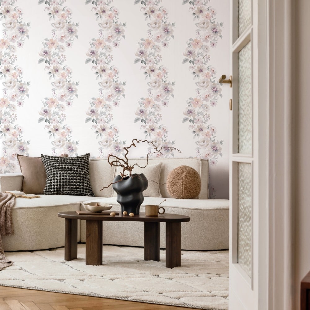 Oriana vaalea kukkatapetti 89013 on hienostunut ja ilmava sisustusratkaisu, joka tuo tilaan ripauksen klassista naisellisuutta ja luonnon kukoistusta. Tapetin kirkkaanvalkoinen tausta toimii raikkaana näyttämönä siroille, pystysuunnassa soljuville kukkaköynnöksille. Kuosin kukat on toteutettu taidokkaalla vesiväritekniikalla, joka antaa väreille pehmeän ja läpikuultavan lopputuloksen. Väripaletti on harmoninen yhdistelmä lämmintä persikkaa, utuista lilaa ja hienovaraisia harmaan ja salvianvihreän sävyjä lehdissä. Tämä tapetti on erinomainen valinta makuuhuoneeseen luomaan rauhoittavaa tunnelmaa tai olohuoneeseen tuomaan herkkää visuaalista kiinnostavuutta säilyttäen silti huoneen avaruuden.