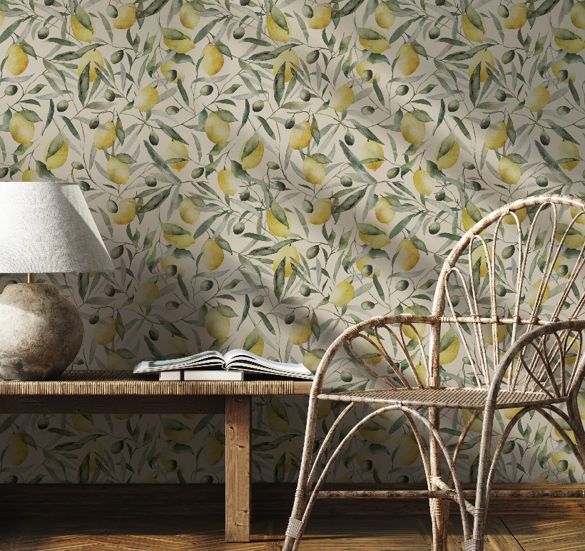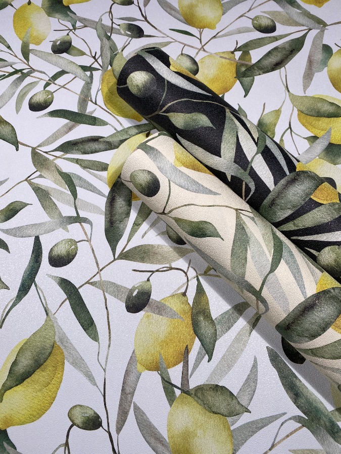 Pompöös Provence Lemon vaalea beige 35619 tapetti tuo raikkautta tilaan sitruuna- ja oliiviaiheisella kuosillaan