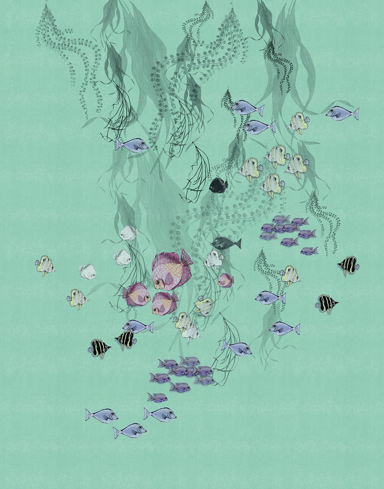 Smart Art Gallery-malliston Sannah kalat ja merenalainen elämä on vaalea ja värikäs meriteemainen tapetti. Kuvakokonaisuuden leveys: 2,12 m ja korkeus: 3,4 m.