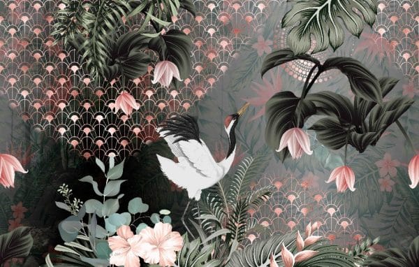 Smart Art Gallery-malliston Belinda on lintu- ja kukka-aiheinen valokuvatapetti tumman vihreän ja roosan sävyissä. Kuvakokonaisuuden leveys: 4,24 m ja korkeus: 2,7 m koostuu 8 paneelista. .