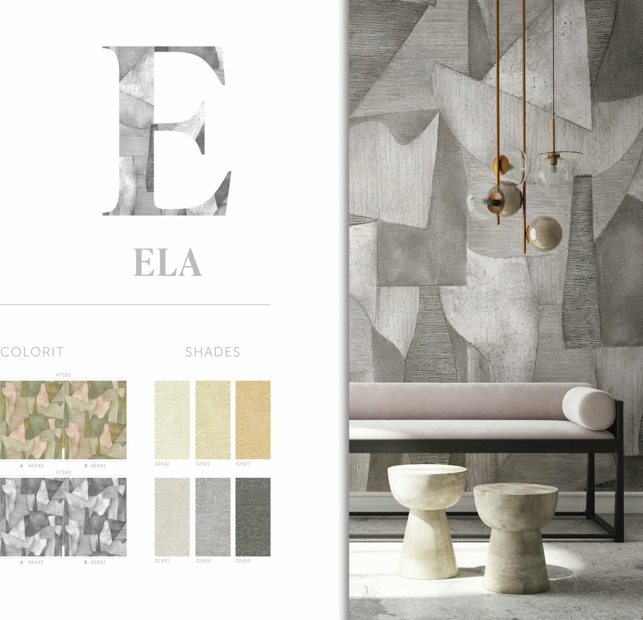 Smart Art Gallery-malliston Ela on abstrakti valokuvatapetti harmaan sävyissä. Kuvakokonaisuuden leveys: 2,65 m ja korkeus: 3,4 m koostuu 5 paneelista. Kuviota on mahdollista jatkaa leveyssuunnassa Ela 47343 tapetilla.