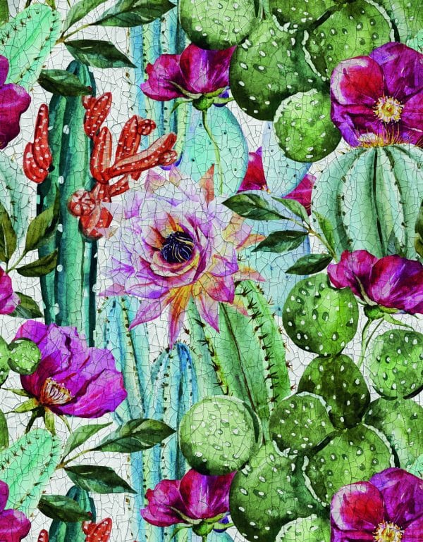 Smart Art Gallery-malliston Kiana on vihreä ja pinkki sävyinen kaktus valokuvatapetti. Kuvakokonaisuuden leveys: 2,65 m ja korkeus: 3,4 m koostuu 5 paneelista. Kuviota on mahdollista jatkaa leveyssuunnassa.