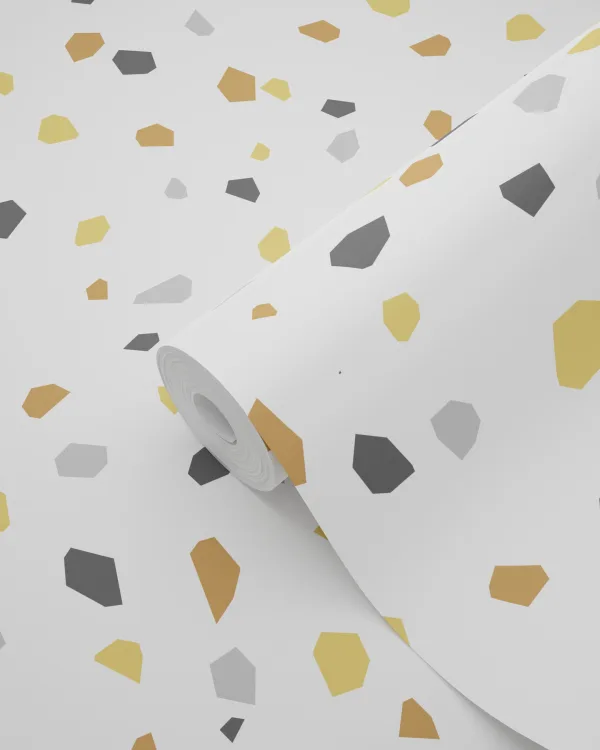 To the moon and back Terrazzo tapetti 139305 valkoisen, sinapin ja harmaan sävyissä. Terrazzo on upea pintajäljitelmä tapetti ja muistuttaa kivipintaa.
