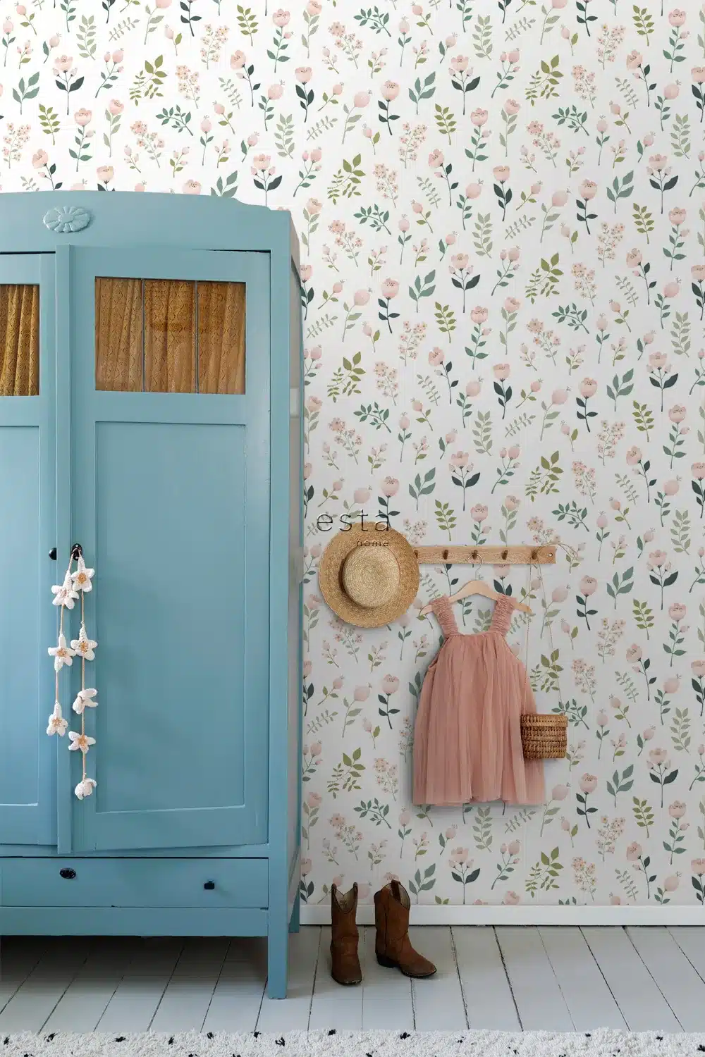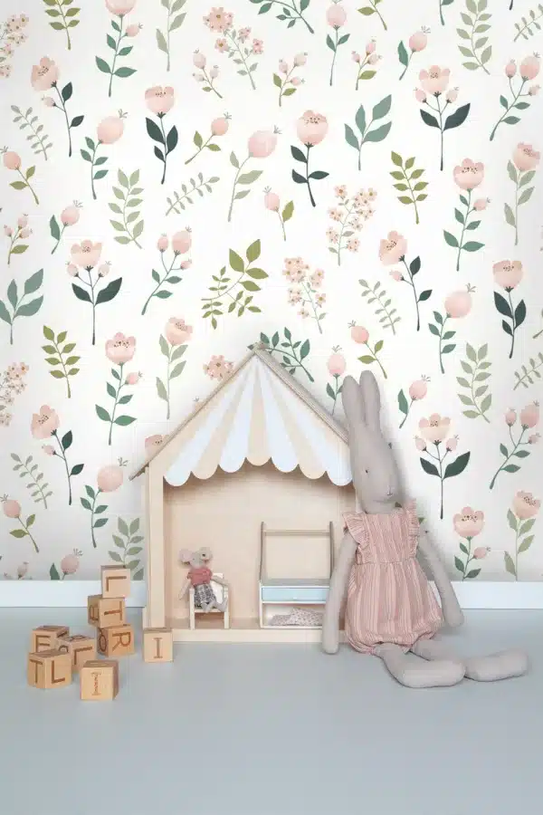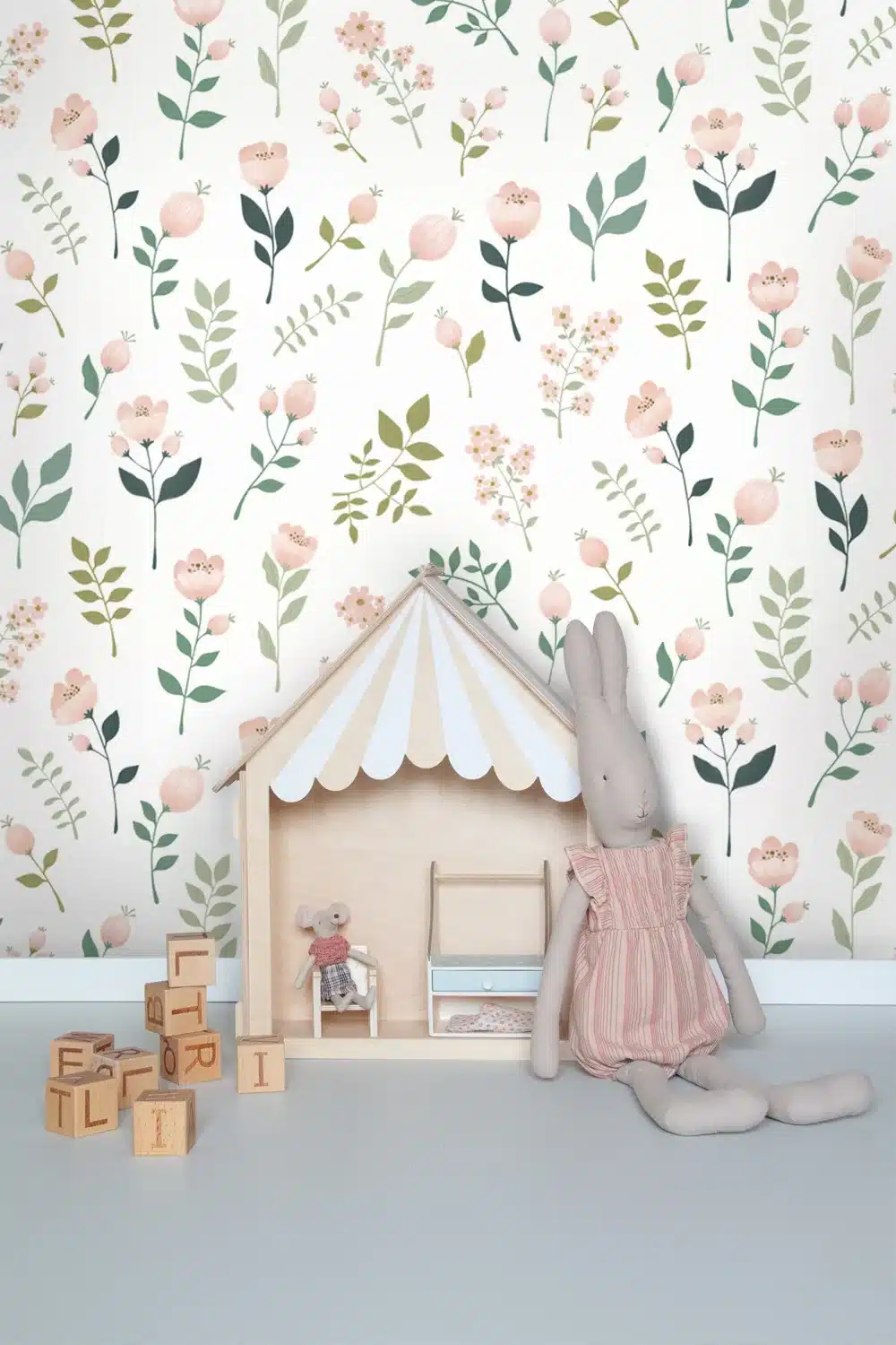 To the moon and back valkoinen kukkatapetti 139339, jossa on vaaleanpunaisia kukkia. Kukkatapetilla luot huoneeseen ihanan romanttisen ja leikkisän tunnelman. Tapetti soveltuu erinomaisesti niin lapsille kuin aikuisille