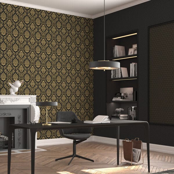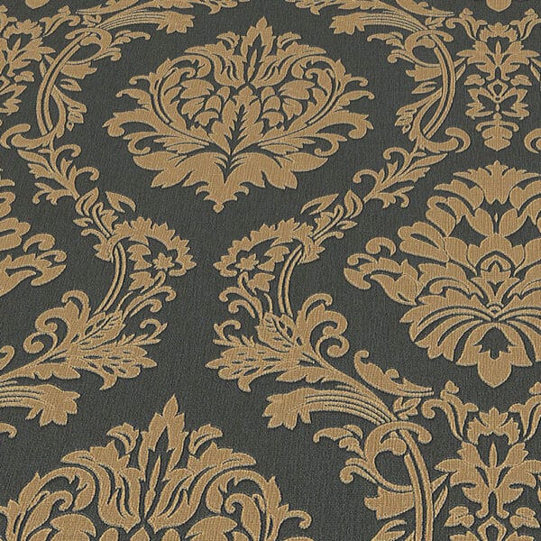 Versailles 10288-15 on klassinen ornamentti tapetti, jossa mustalla pohjalla kultainen kuvio. Tapetin kuviossa on pieni kiilto. Tapetti on valmistettu laadukkaasta kuidusta ja sitä voi puhdistaa pehmeällä sienellä ja miedolla astianpesuaineella. Suosittelemme käyttämään asennuksessa valmisliimaamme.