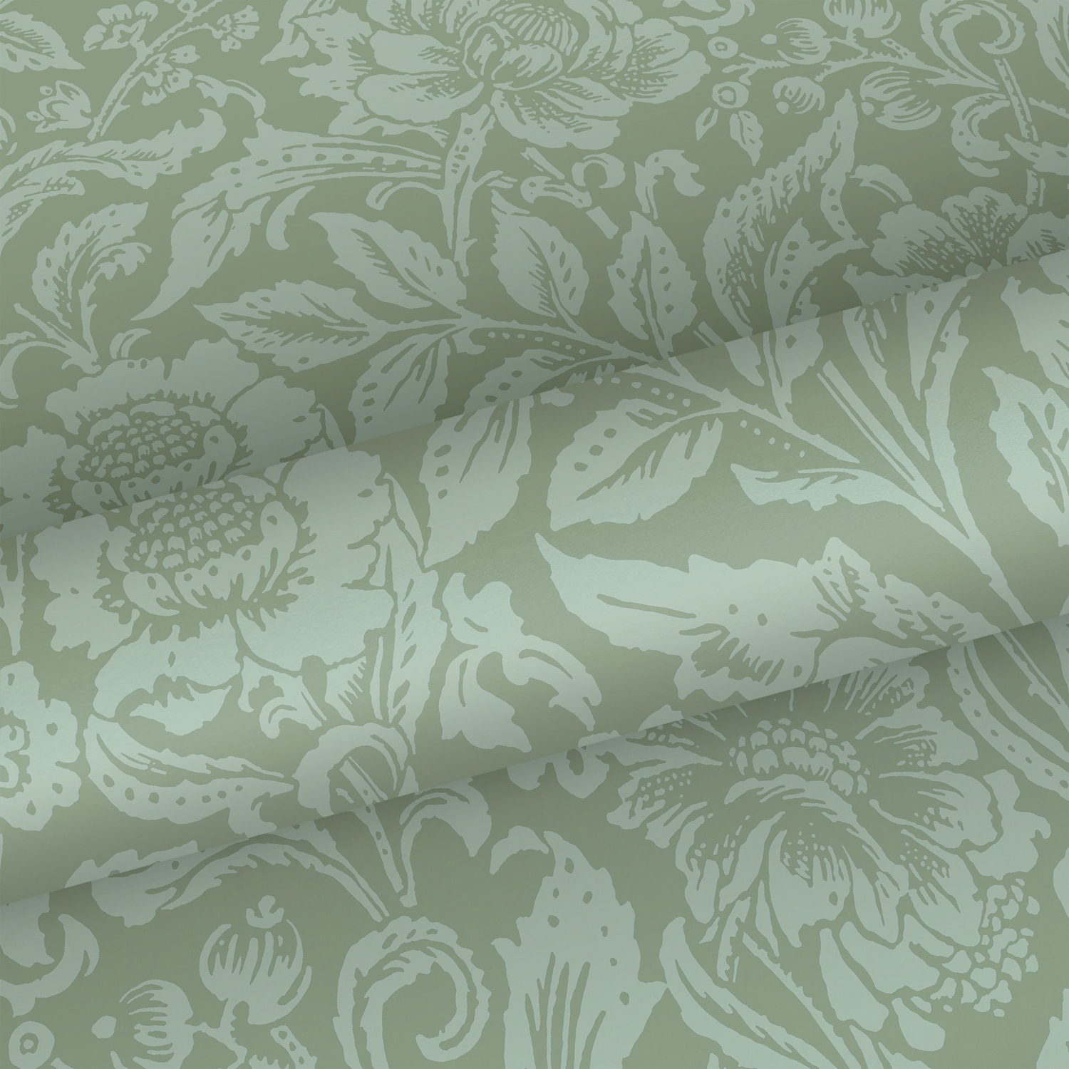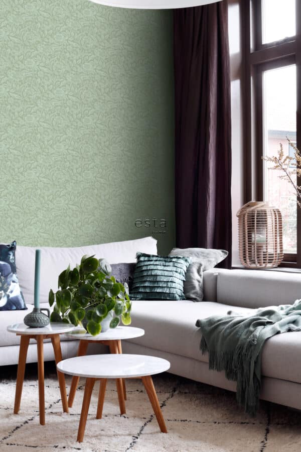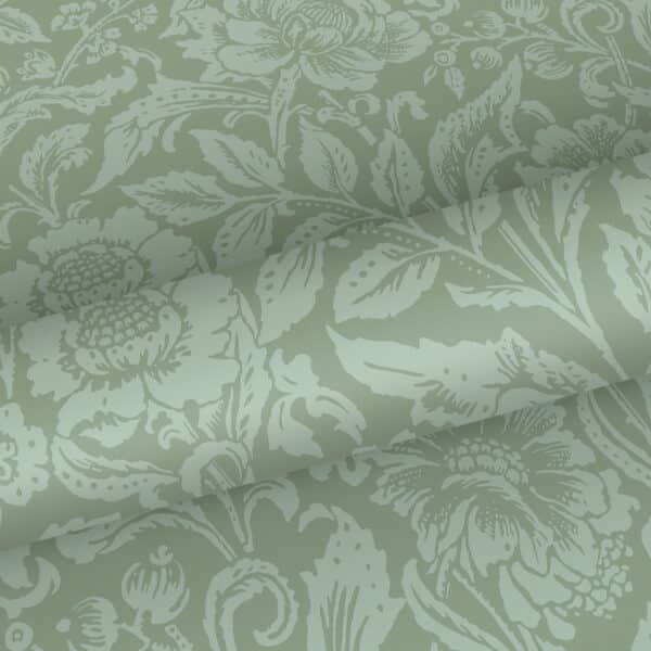 Kaunis tapetti, jossa on harmahtavan mintunvihreitä vintage-kukkia.