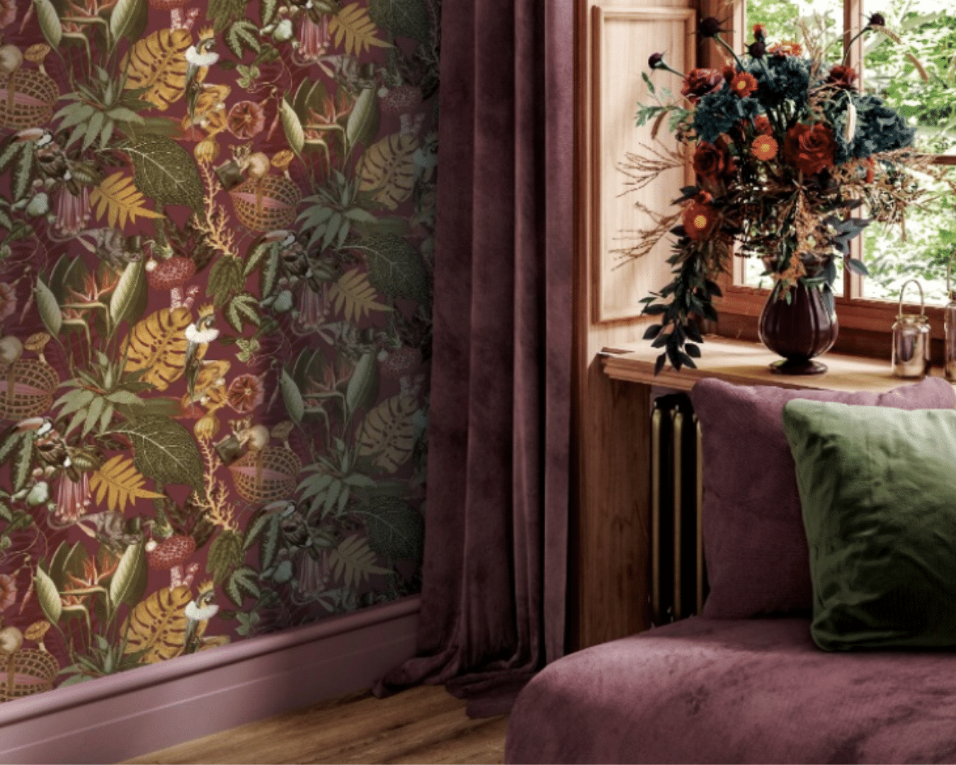 Viininpunaiset huonekalut ja kodin tekstiilit ovat näyttäviä jo sellaisenaan. Niiden kanssa tapettivalinnassa kannattaa hakea tasapainoa ja kontrastia.