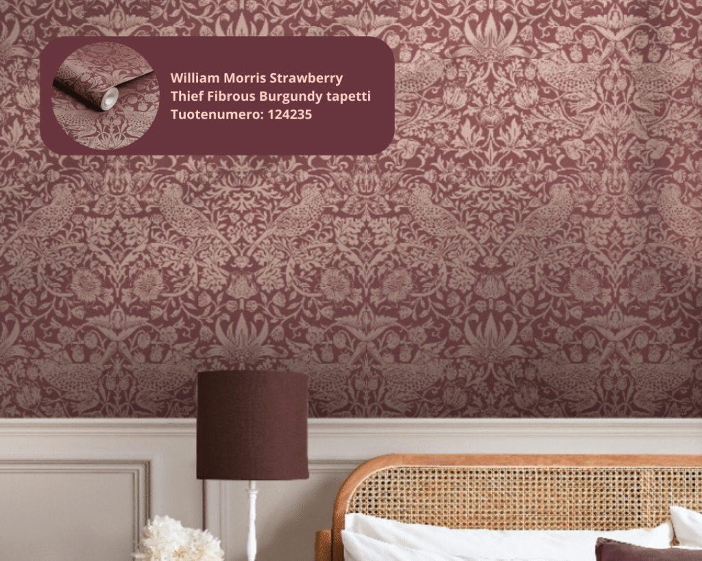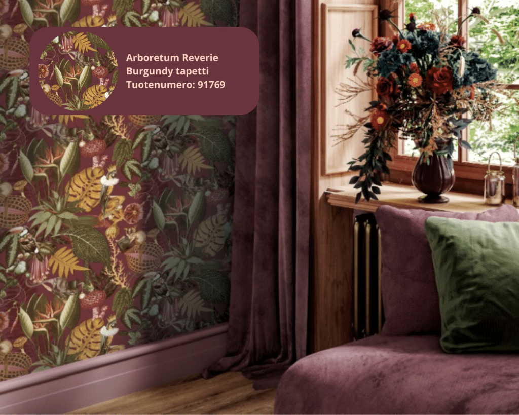 Viininpunaiset tapetit tarjoavat mahdollisuuden luoda tilaan tunnelmaa, persoonallisuutta ja ripauksen luksusta ilman, että kokonaisuus tuntuu raskaalta. Oikein yhdistettynä burgundy on yllättävän monipuolinen ja helppo käyttää.