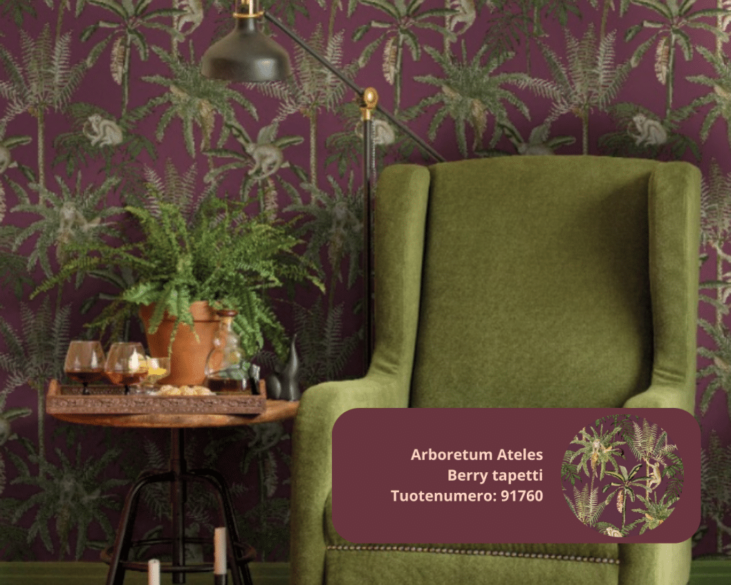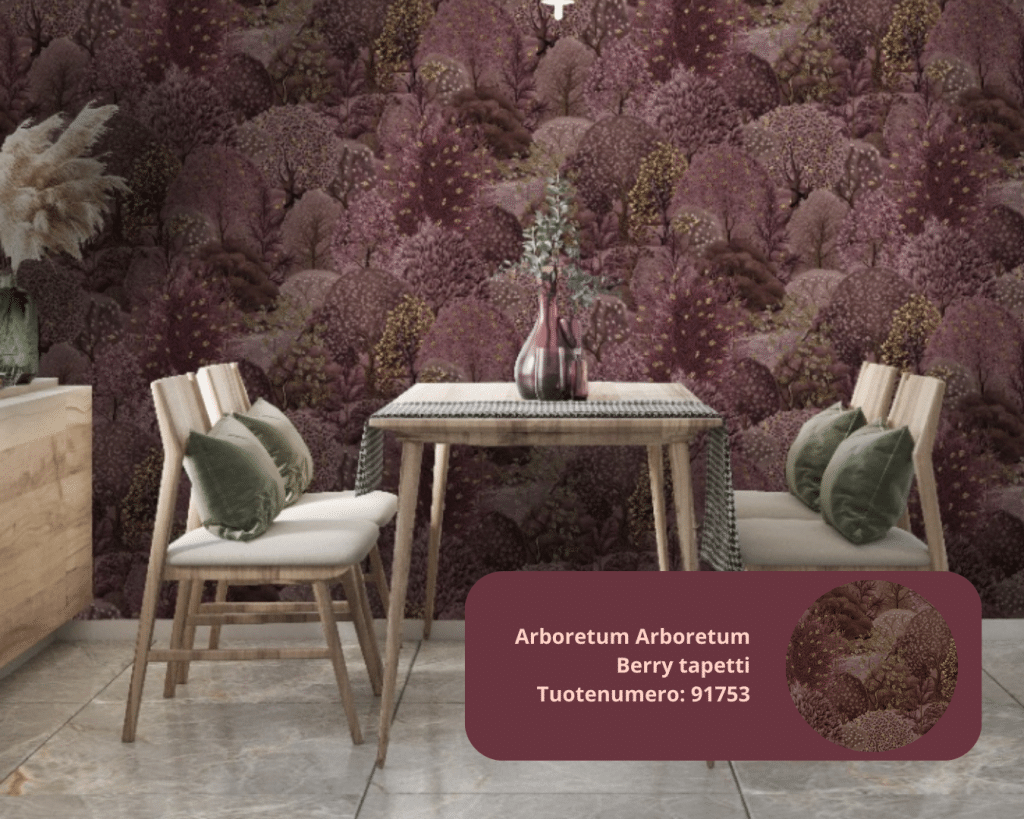 Viininpunaiset tapetit ovat luonteva jatkumo tälle trendille. Ne tuovat tilaan samanlaista syvyyttä ja arvokkuutta kuin burgundi-vaatteet asukokonaisuuteen. Sisustuksessa väri pääsee loistamaan suurina pintoina ja luomaan kokonaisvaltaista tunnelmaa.
